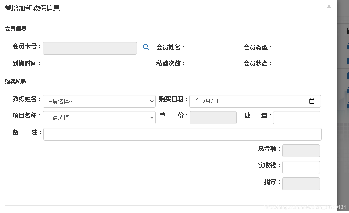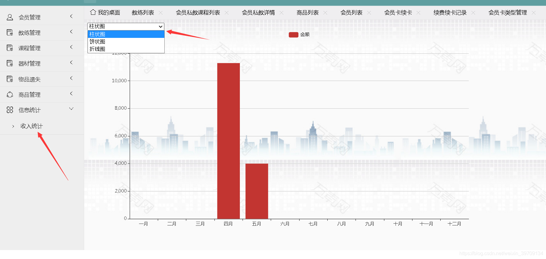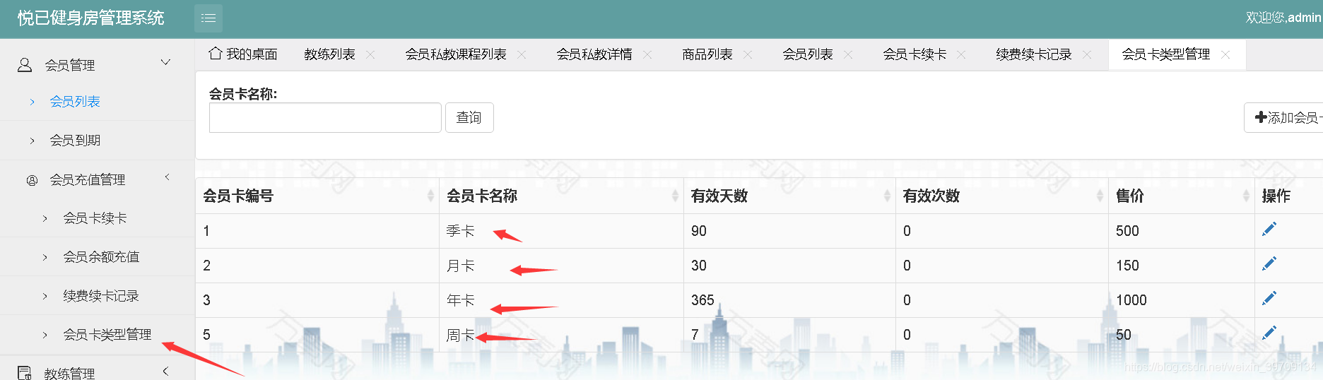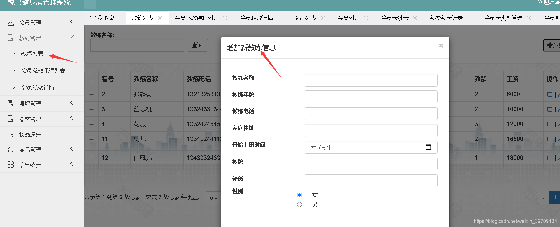 首页主要功能有:会员信息管理、会员到期续费管理、充值管理、教练课程管理、私教管理、器材管理、小商品售卖管理、信息统计、修改密码等主要功能