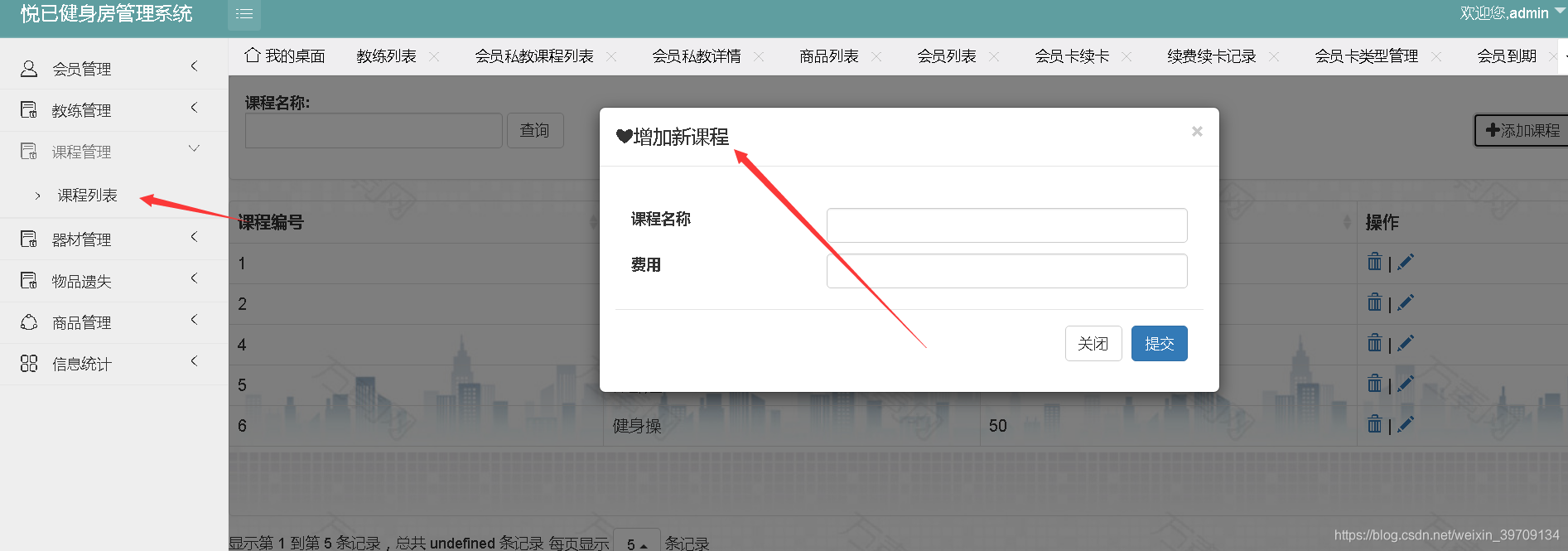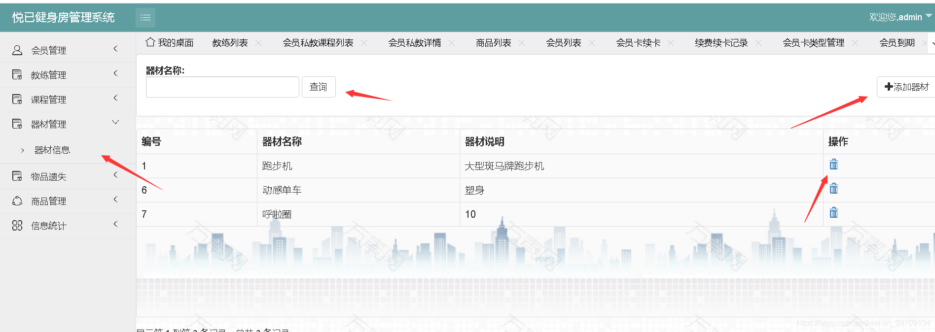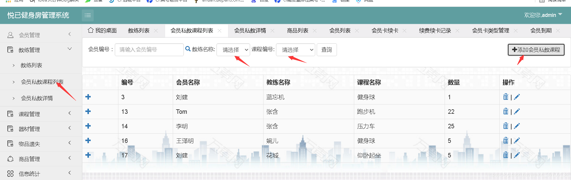 主要功能设计:用户登录、会员管理、教练管理、课程管理、器材管理、会员充值、物品遗失、商品管理、信息统计、修改密码