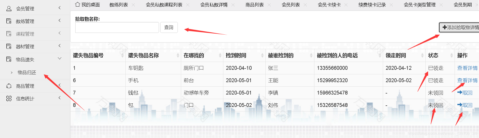 物品遗失管理、归还、添加丢失物品、查询、取回丢失物品等