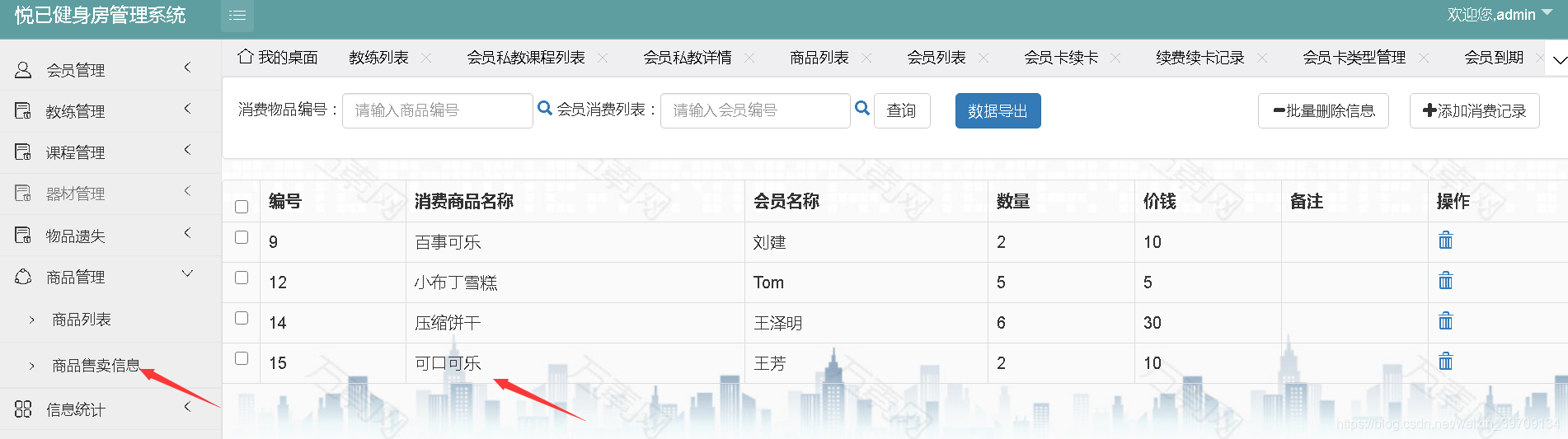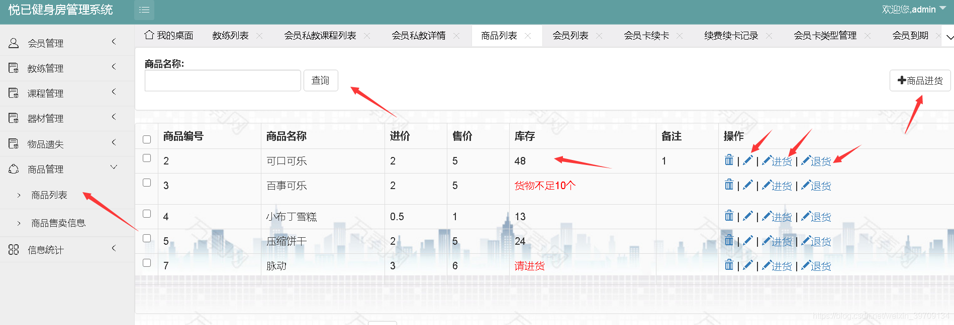 健身房小商品售卖管理:列表数据展示、查询、进货、售卖 退货等操作