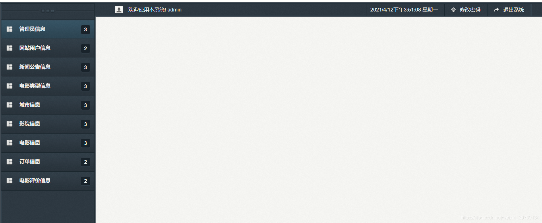 后台主要就是数据的管理和维护以及票务,用户、影院、影片的管理、就不一一截图了、功能是完善的
