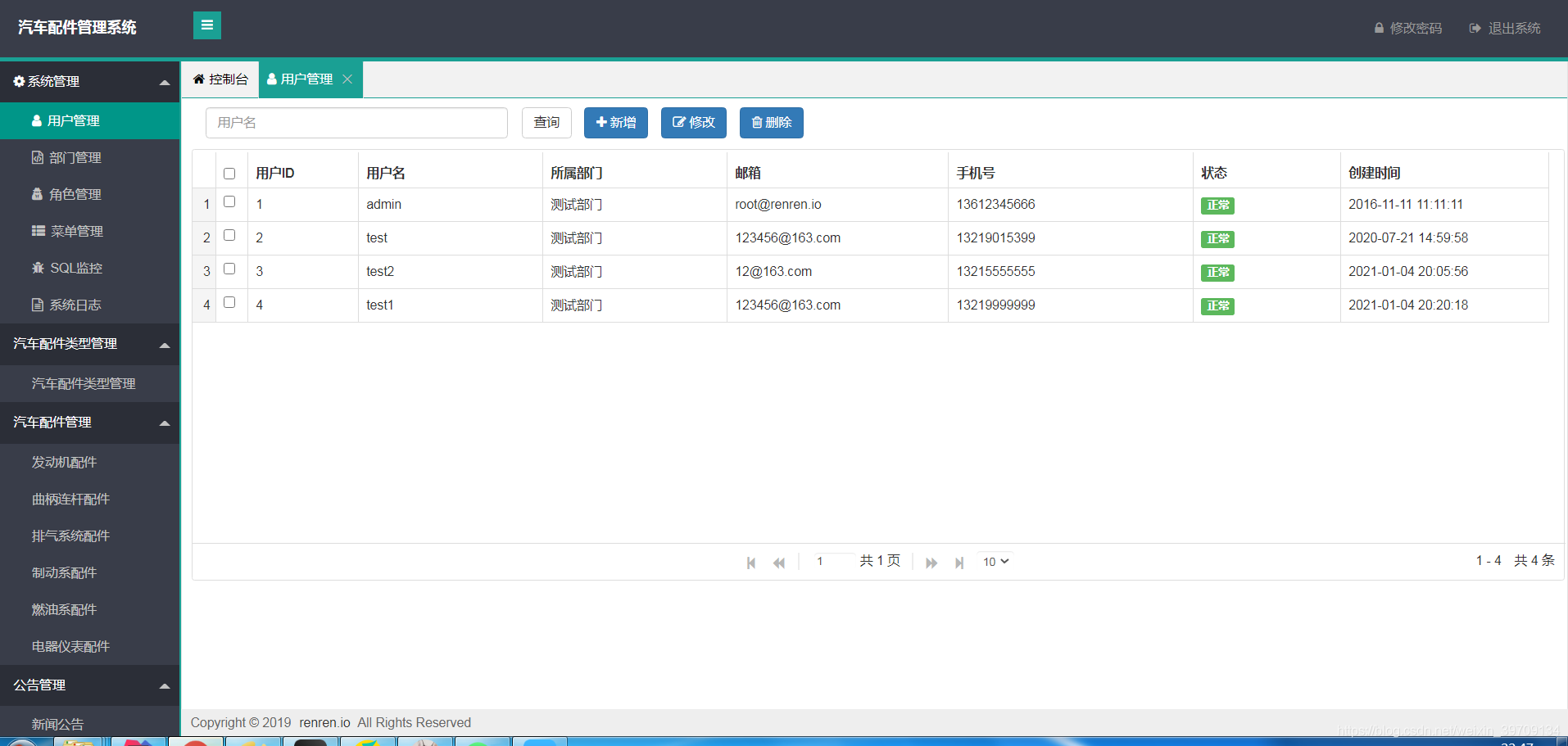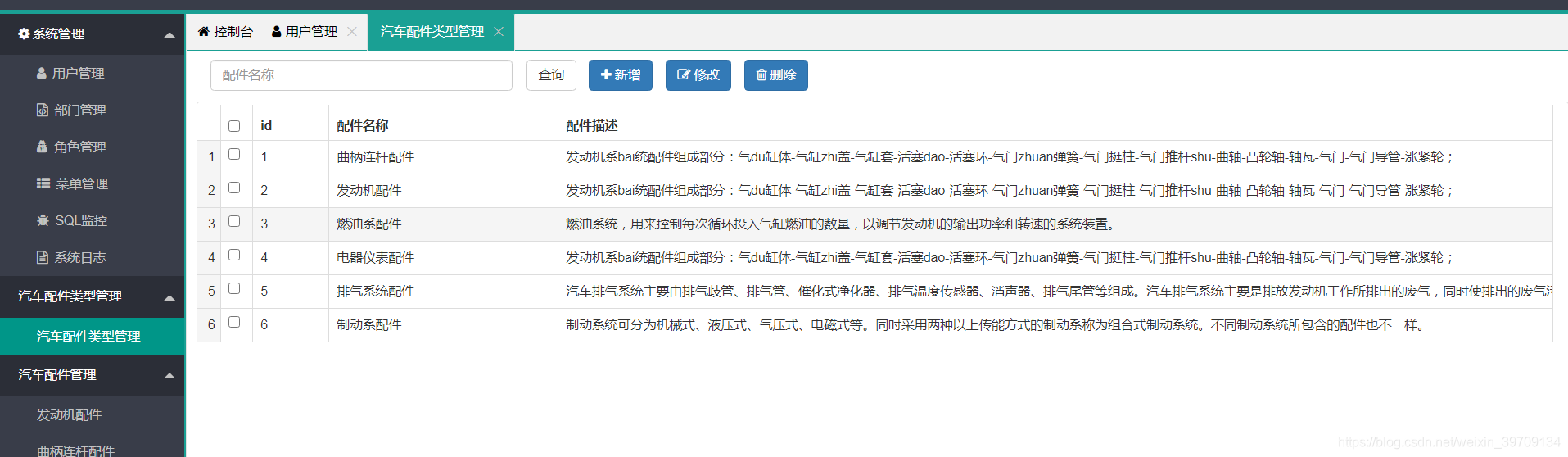 5.汽车配件类型管理:汽车配件类型管理列表查看、添加、修改、删除