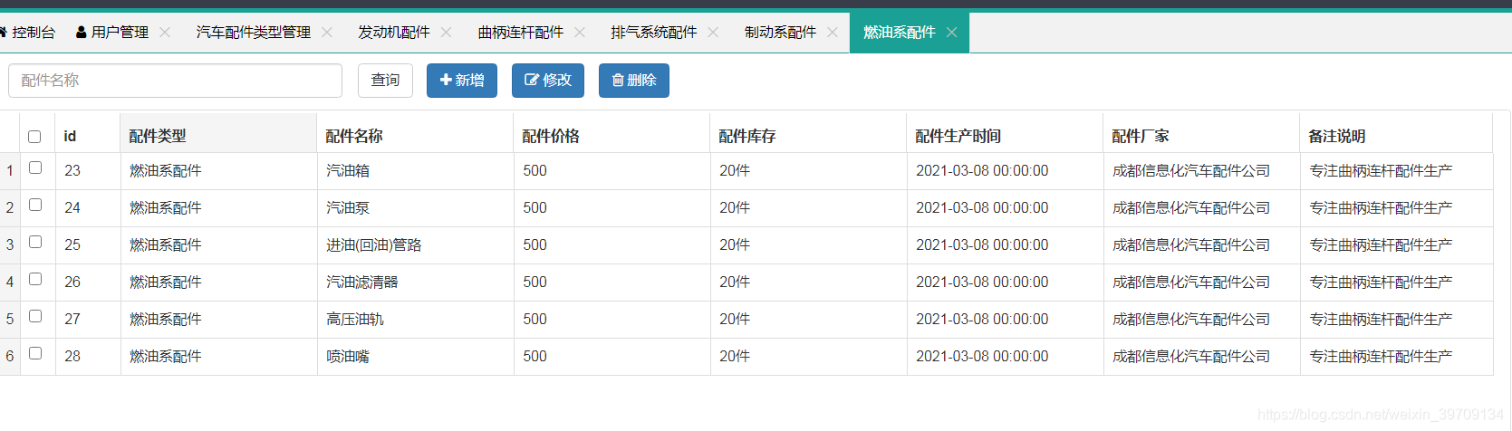 6.汽车配件模块管理:汽车配件查询、添加、删除、修改、