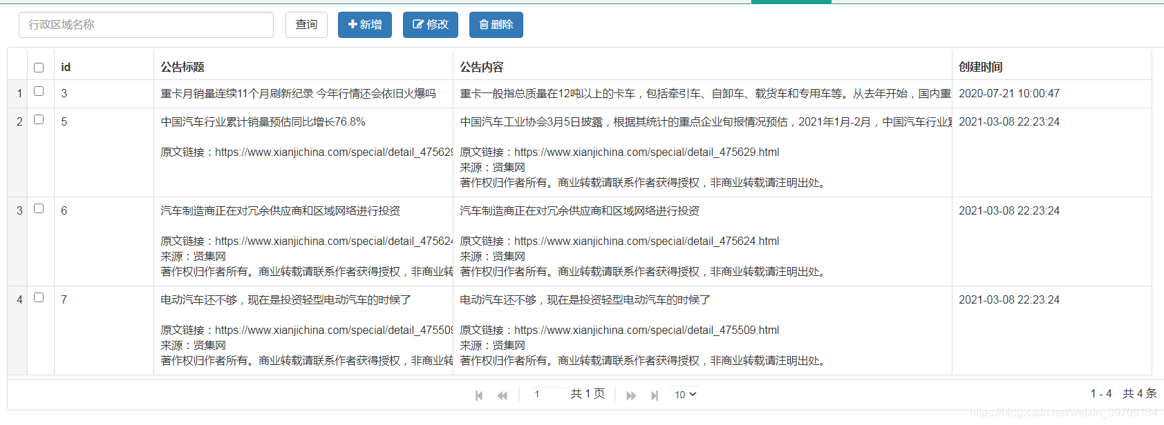 7.通知公告模块管理:通知公告查询、添加、修改、删除操作