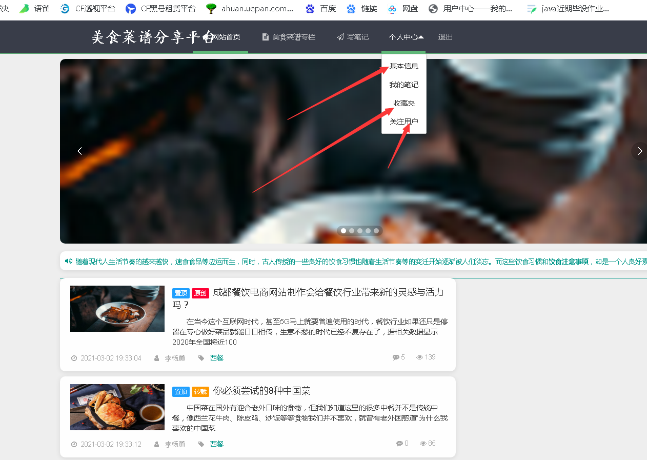 这是一个功能比较完善的美食菜谱生活分享系统、主要功能为实现了客户端美食笔记查看、首页轮播图、发布美食笔记信息、收藏、关注用户、浏览量查看、评论、后台管理员对用户、美食类型、美食、公告信息、评论等基本数据管理等