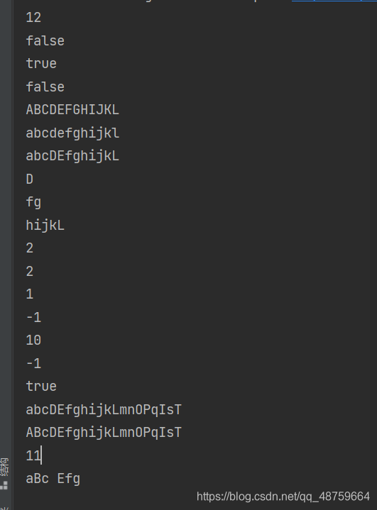 import java.util.function.BiConsumer;public class TestString {public static void main(String[] args) {//1.创建一个String对象String str = "abcDEfghijkL";//2.操作该String对象//2.1最简单的方法System.out.println(str.length());//6System.out.println(str.isEmpty());//length==0System.out.println(str.startsWith("abc"));//trueSystem.out.println(str.endsWith("kl"));//falseSystem.out.println(str.toUpperCase());System.out.println(str.toLowerCase());System.out.println(str);//2.2根据索引确定子串System.out.println(str.charAt(3));System.out.println(str.substring(5,7));System.out.println(str.substring(7));//2.3根据子串确定索引System.out.println(str.indexOf("c"));System.out.println(str.indexOf("cDE"));//从第一个字符开始查找,返回找到的第一个匹配的子串的索引System.out.println(str.indexOf("bc"));//如果不存在就返回-1System.out.println(str.indexOf("BC"));//-1System.out.println(str.lastIndexOf("kL"));System.out.println(str.indexOf("DE",8));//-1//其他boolean flag = str.contains("abc");System.out.println(flag);str = str.concat("mn").concat("OPq").concat("IsT");System.out.println(str);str = str.replace("ab","AB");System.out.println(str);String str3 = "    aBc Efg";System.out.println(str3.length());System.out.println(str3.trim());}