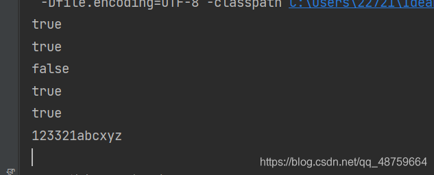 package demo07;public class TestString2 {public static void main(String[] args) {String str1 = "abc123";String str2 = "abc123";System.out.println(str1==str2);//trueSystem.out.println(str1.equals(str2));//trueString str3 = new String("abc");String str4 = new String("abc");System.out.println(str3==str4);//falseSystem.out.println(str3.equals(str4));//trueString str5 = "";String str6 = null;System.out.println(str5.isEmpty());//trueString str7 = "123";str7 = str7.concat("321");//最后添加str7 = str7.concat("abc");str7 = str7.concat("xyz");System.out.println(str7);}