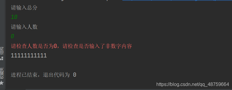 package demo01;import java.util.Scanner;public class TestException {public static void main(String[] args) {Scanner input = new Scanner(System.in);//输入总分try{System.out.println("请输入总分");int sum = input.nextInt();System.out.println("请输入人数");int count = input.nextInt();int result = sum/count;System.out.println("result="+result);}catch (Exception e){//System.out.println(e.toString());//System.out.println(e.getMessage());//by zeroSystem.err.println("请检查人数是否为0,请检查是否输入了非数字内容");//继续向上抛//throw e;}System.out.println("11111111111");}