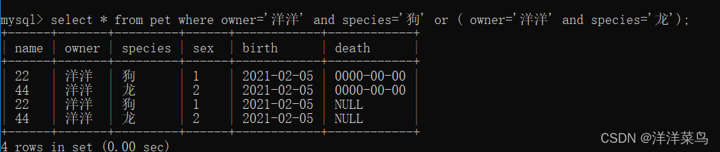 select * from pet where owner='洋洋' and species='狗' or ( owner='洋洋' and species='龙');返回: