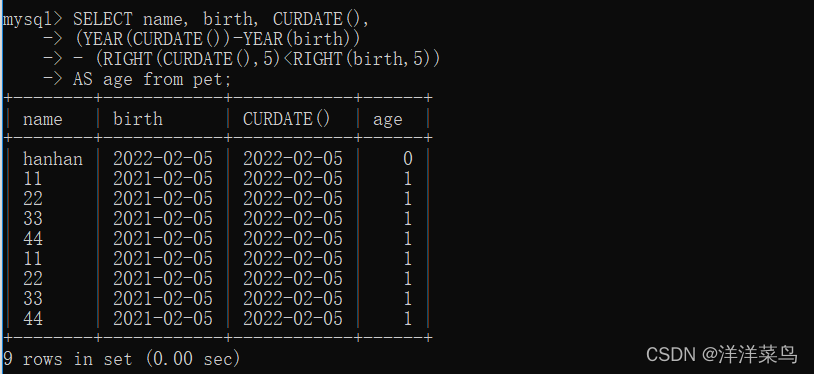 SELECT name, birth, CURDATE(),(YEAR(CURDATE())-YEAR(birth)) - (RIGHT(CURDATE(),5)<RIGHT(birth,5)) AS age from pet;如果代码太长,可以分着写,如下