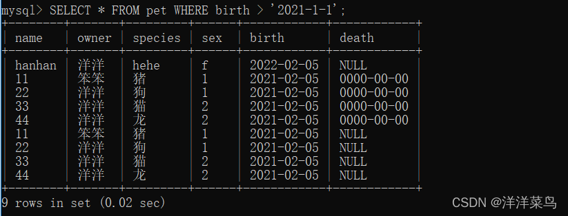 SELECT * FROM pet WHERE birth > '2021-1-1';返回: