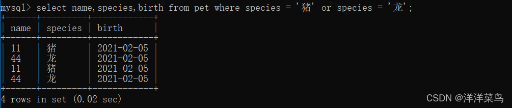 select name,species,birth from pet where species = '猪' or species = '龙';返回: