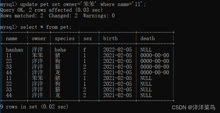 update pet set owner='笨笨' where name='11';返回:
