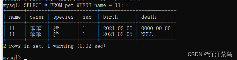 SELECT * FROM pet WHERE name = 11;返回: