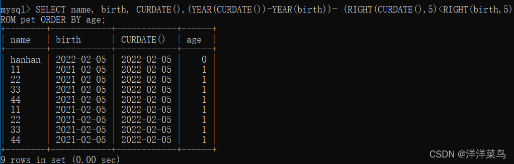 SELECT name, birth, CURDATE(),(YEAR(CURDATE())-YEAR(birth))- (RIGHT(CURDATE(),5)<RIGHT(birth,5)) AS age FROM pet ORDER BY age;返回: