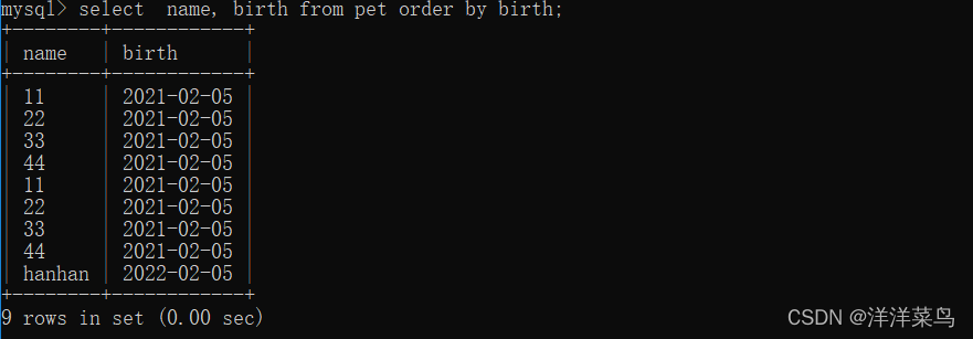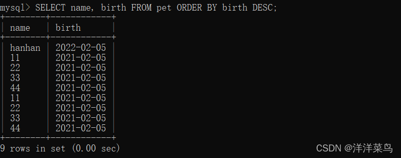 SELECT name, birth FROM pet ORDER BY birth DESC;返回: