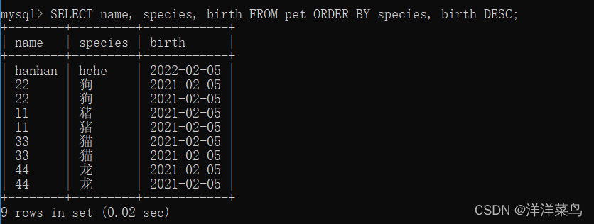 SELECT name, species, birth FROM pet ORDER BY species, birth DESC;返回: