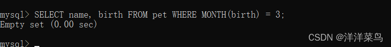 SELECT name, birth FROM pet WHERE MONTH(birth) = 3;返回: