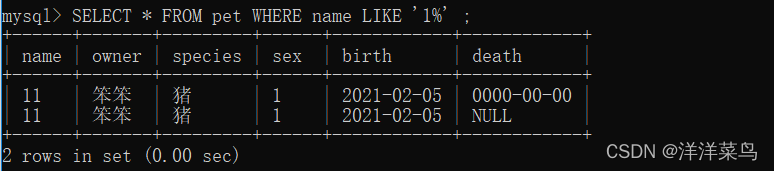 SELECT * FROM pet WHERE name LIKE '1%' ;返回: