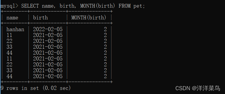 SELECT name, birth, MONTH(birth) FROM pet;返回:
