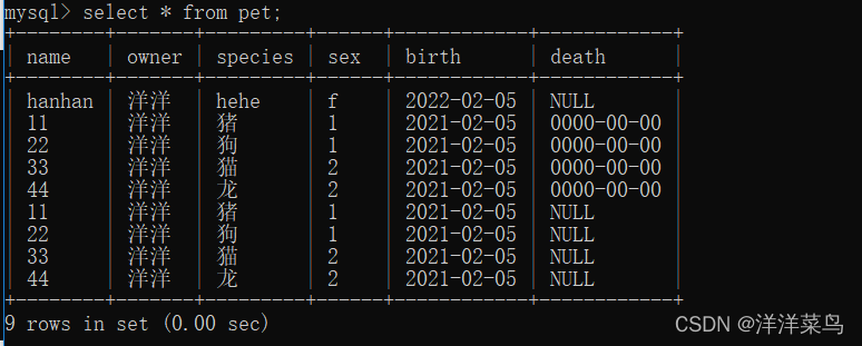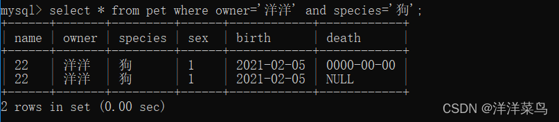 select * from pet where owner='洋洋' and species='狗';返回: