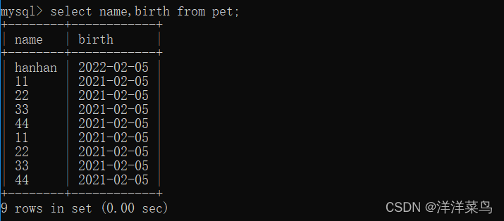 select name,birth from pet;返回: