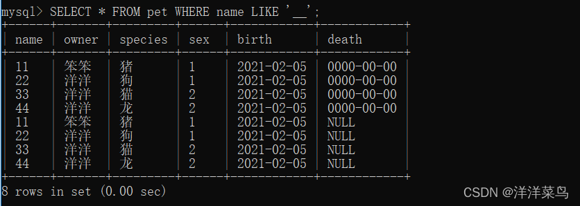 SELECT * FROM pet WHERE name LIKE '__';返回: