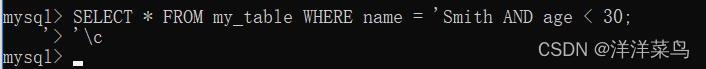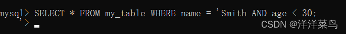 SELECT * FROM my_table WHERE name = 'Smith AND age < 30;