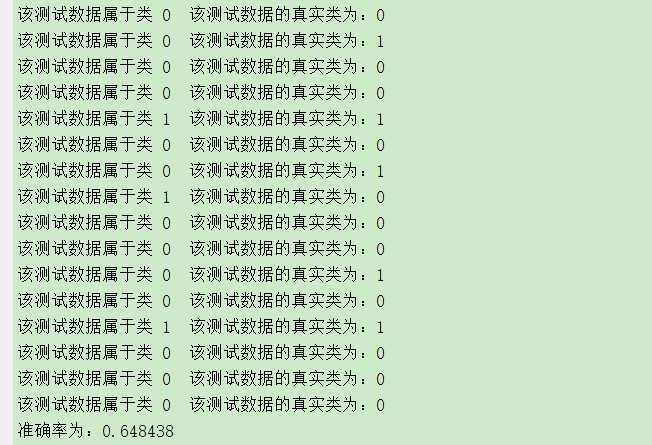 for i=1:num_testidx=KNN(trainData(num_test+1:N,:),trainClass(num_test+1:N,:),trainData(i,:),K);fprintf('该测试数据的真实类为:%d\n',trainClass(i,:));if idx~=trainClass(i,:);error=error+1;end