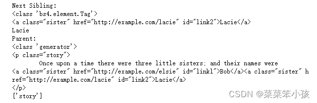 - find_all_next()和find_next():前者返回节点后所有符合条件的节点,后者返回第一个符合 条件的节点。