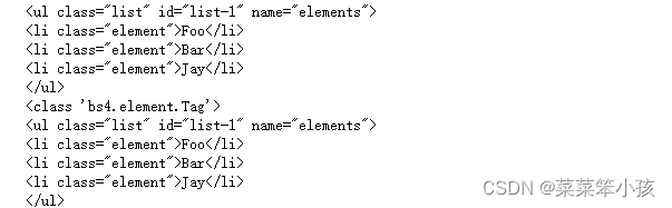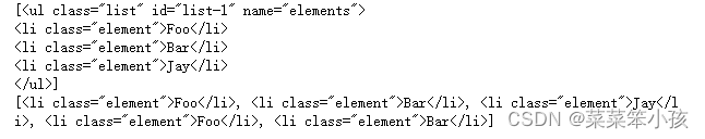 这里查询的时候传人的是attrs参数,参数的类型是字典类型。比如,要查询id为list-1的节 点,可以传入attrs={'id': * list-1'}的查询条件,得到的结果是列表形式,包含的内容就是符合id 为list-1的所有节点。在上面的例子中,符合条件的元素个数是1,所以结果是长度为1的列表。