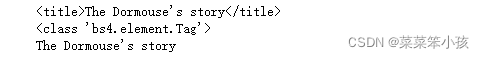 第一行结果是调用head之后再次调用title而选择的title节点元素。然后打印输出了它的类型, 可以看到,它仍然是bs4.element.Tag类型。也就是说,我们在Tag类型的基础上再次选择得到的依 然还是Tag类型,每次返回的结果都相同,所以这样就可以做嵌套选择了。