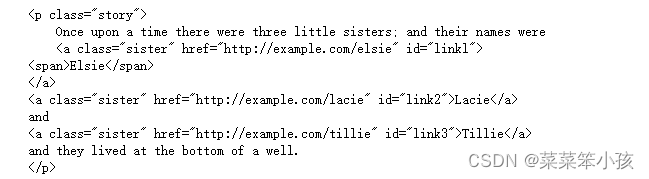 <p class="story"> Once upon a time there were three little sisters; and their names were <a href="http://example.com/elsie" class="sister" id="linkl">