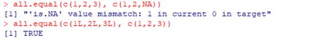 all.equal(c(1L,2L,3L), c(1,2,3)) 返回: