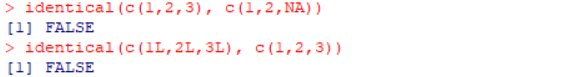 identical(c(1L,2L,3L), c(1,2,3)) 因为前一向量是整数型,后一向量是实数型,结果返回: