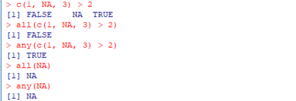 若 cond 是逻辑向量,用 all(cond) 测试 cond 的所有元素为真;用 any(cond) 测试 cond 至少一个元素为真。cond 中允许有缺失值,结果可能为缺失值。如