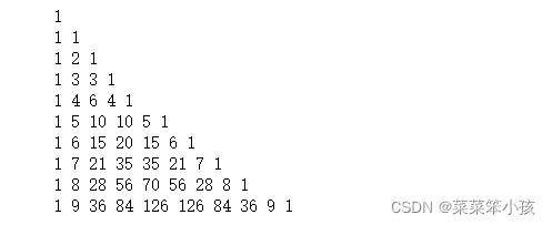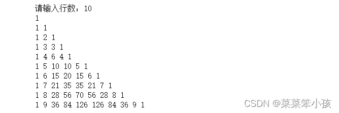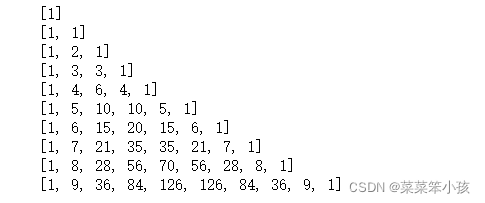 for i in yanghui():# 打印每行的列表的元素,用空格连接print(" ".join(str(j) for j in i))# 打印完一行,n+1n += 1# 如果变量n等于输入的行数,跳出for循环if n == 10:# 跳出循环break