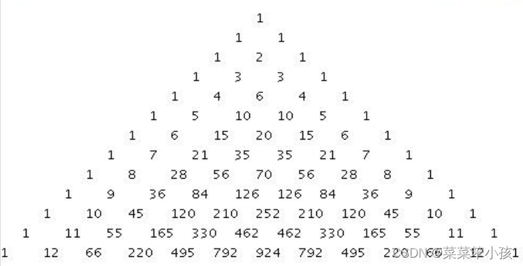 for i in yanghui():# 打印每行的列表的元素,用空格连接print(" ".join(str(j) for j in i))# 打印完一行,flag+1flag += 1# 如果变量flag等于输入的行数,跳出for循环if flag == n:# 跳出循环break