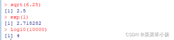 ## [1] 2 4 6 8 10 12 14 16 18 20 R 的许多函数都可以用向量作为自变量,结果是自变量的每个元素各自的函数值。如