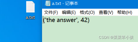 with open(r'D:\桌面\a.txt','a') as f:value = ('the answer', 42)s = str(value) #转换为字符串类型f.write(s)