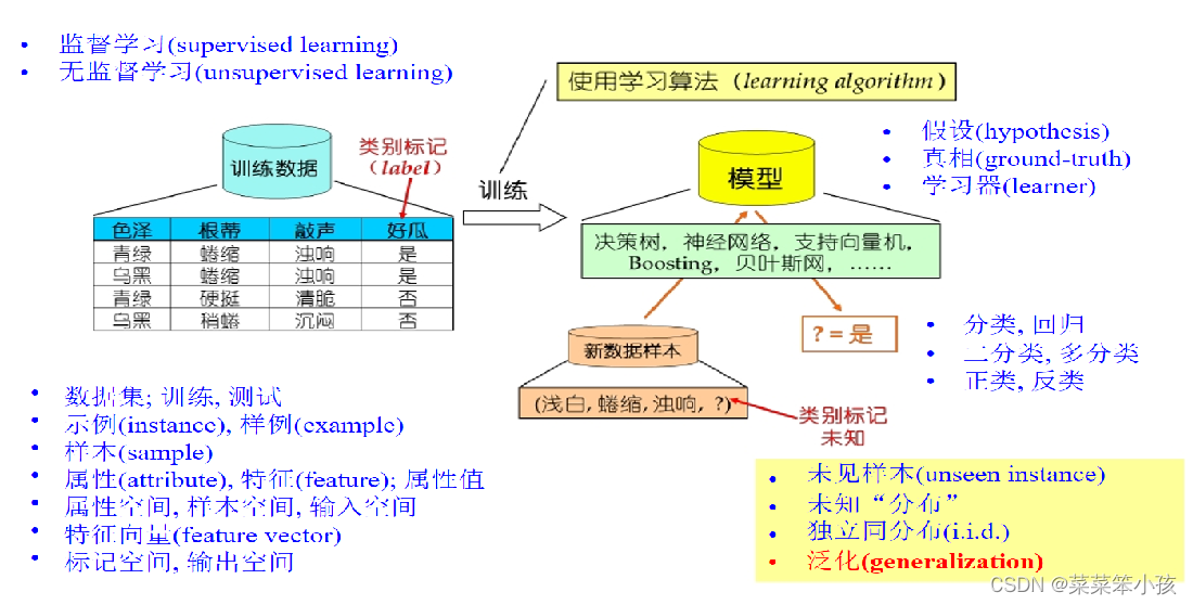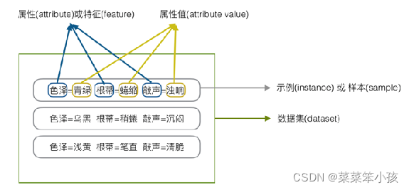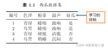 - 有前面的样本数据显然是不够的,要建立这样的关于“预测”(prediction) 的模型,我们需获得训练样本的“结果”信息,例如“((色泽=青绿;根蒂=蜷缩;敲声= =浊响),好瓜)”.这里关于示例结果的信息,例如“好瓜”,称为“标记”(label); 拥有了标记信息的示例,则称为“样例”(example).