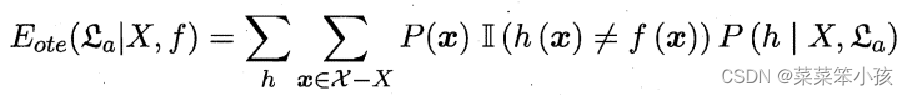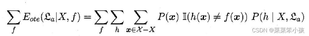 简单起见,假设样本空间χ和假设空间Η都是离散的。令P(ℎ│X,ℒa)代表算法ℒa基于训练数据X产生假设ℎ的概率。令f代表希望学习的真实目标函数。则ℒa在训练集之外所有样本上的总误差为: