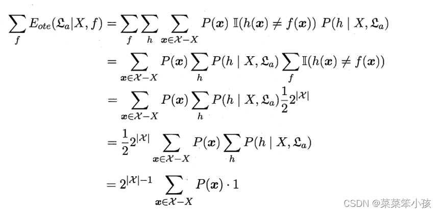 考虑二分类问题,目标函数可以为任何函数χ⟼{0,1},函数空间为{0,1}^|χ|,对所有可能的f按均匀分布对误差求和,有: