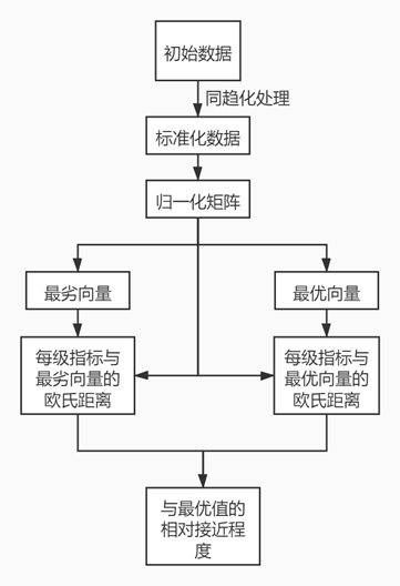 TOPSIS法亦被称为理想解法,是一种综合评价方法,该方法能够充分利用原始数据,精确反映各评价方案之间的差距,对数据分布及其样本含量没有严格限制。能有效地解决多指标评价问题,该方法通过构造评价问题的正理想解(最优解)和负理想解(最劣解),计算每个方案到理想方案的相近贴进度,即靠近最优解和远离最劣解的程度,来对方案进行排序,从而选出最佳方案,具体流程如下图所示。