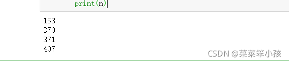 for n in range(100,1000):i = n // 100 #取个位j = n // 10 % 10 #取十位k = n % 10 #取百位if n == i*i*i + j*j*j + k*k*k: print(n)