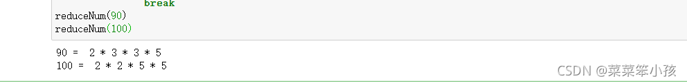 def reduceNum(n):print ('{} = '.format(n), end=" ")if not isinstance(n, int) or n <= 0 :print ('请输入一个正确的数字 !')exit(0)elif n in [1] :print ('{}'.format(n))while n not in [1] : # 循环保证递归for index in range(2, n + 1) :if n % index == 0:n //= index # n 等于 n//indexif n == 1: print (index )else : # index 一定是素数print ('{} *'.format(index), end=" ")break