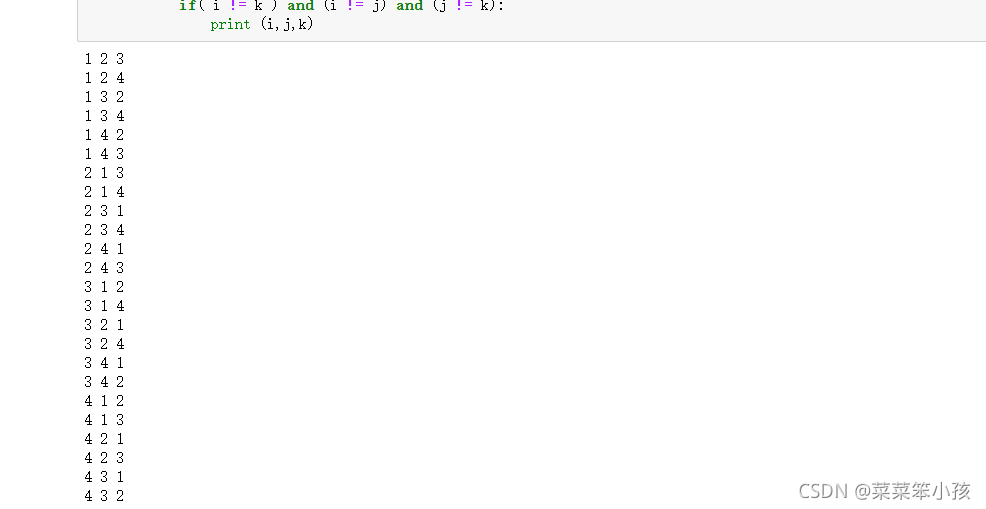 for i in range(1,5):for j in range(1,5):for k in range(1,5):if( i != k ) and (i != j) and (j != k):print (i,j,k)