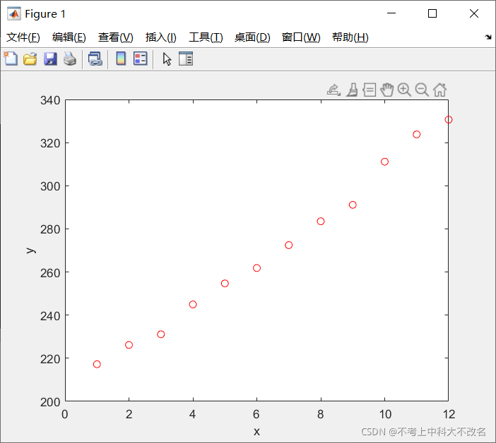 运行一下就得到了p=10.5408和202.2139;因此上述数据得到了一元函数y=10.5048*x+202.2139。