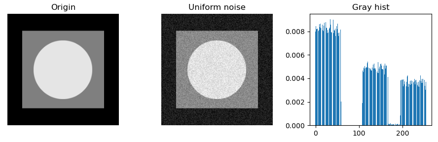 # # 9.5:均匀噪声 (Uniform noise)img = cv2.imread("../images/Fig0503.tif", 0) # flags=0 读取为灰度图像# img = np.ones([256, 256]) * 128mean, sigma = 10, 100a = 2 * mean - np.sqrt(12 * sigma) # a = -14.64b = 2 * mean + np.sqrt(12 * sigma) # b = 54.64noiseUniform = np.random.uniform(a, b, img.shape)imgUniformNoise = img + noiseUniformimgUniformNoise = np.uint8(cv2.normalize(imgUniformNoise, None, 0, 255, cv2.NORM_MINMAX)) # 归一化为 [0,255]plt.figure(figsize=(9, 3))plt.subplot(131), plt.title("Origin"), plt.axis('off')plt.imshow(img, 'gray', vmin=0, vmax=255)plt.subplot(132), plt.title("Uniform noise"), plt.axis('off')plt.imshow(imgUniformNoise, 'gray')plt.subplot(133), plt.title("Gray hist")histNP, bins = np.histogram(imgUniformNoise.flatten(), bins=255, range=[0, 255], density=True)plt.bar(bins[:-1], histNP[:])plt.tight_layout()plt.show()