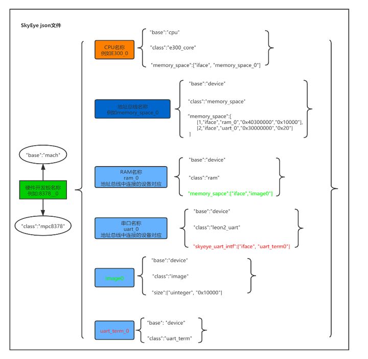 SkyEye通过json文件来对真实硬件开发板进行描述,可以理解为一个json文件对应于一块真实的硬件开发板。大体结构我们参照图1-1-2来进行讲解: